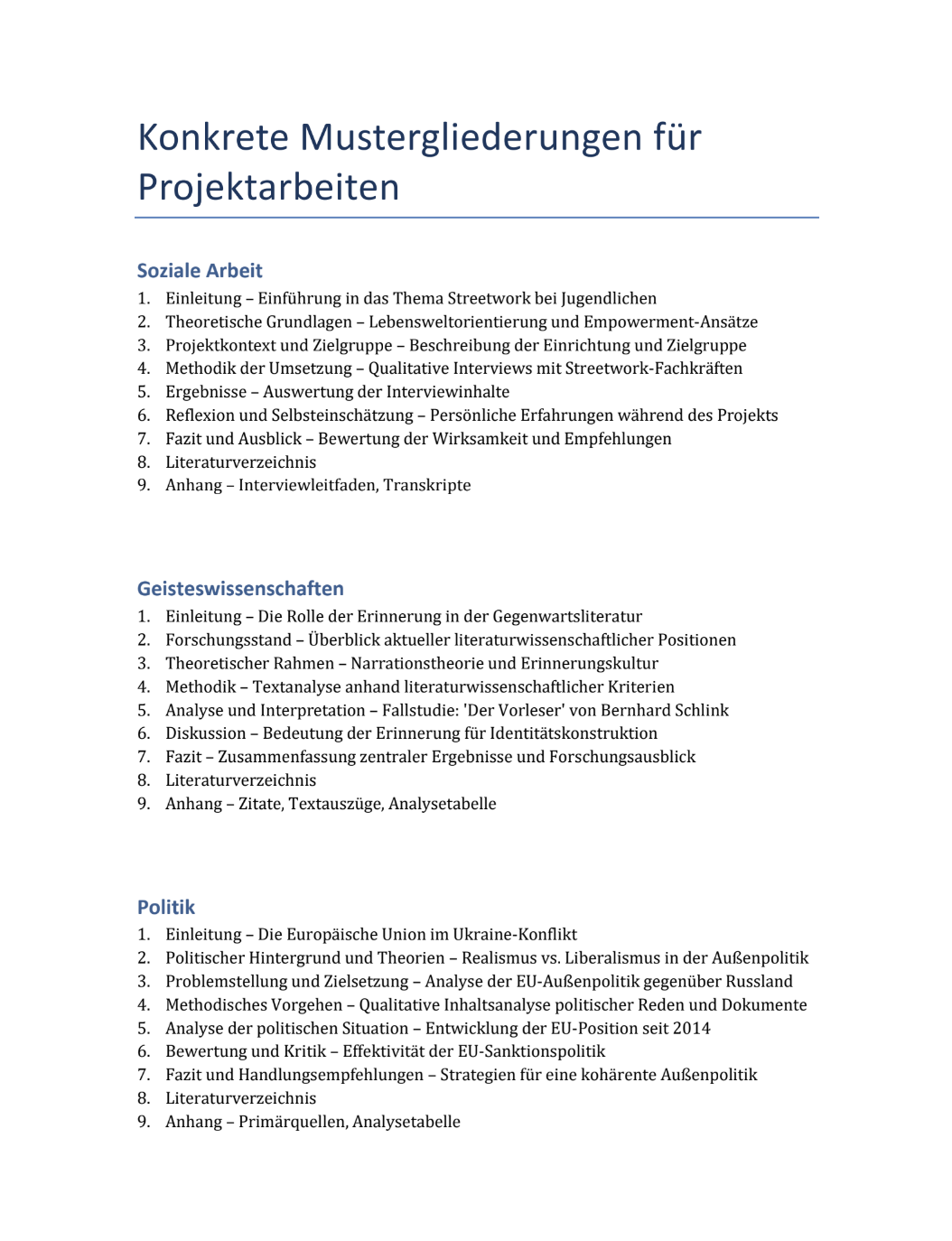 Lade dir hier unsere konkreten Mustergliederungen für Soziale Arbeit, BWL, Politik und Geisteswissenschaften als PDF oder Word-Datei herunter – ideal als Vorlage für deine eigene Projektarbeit.