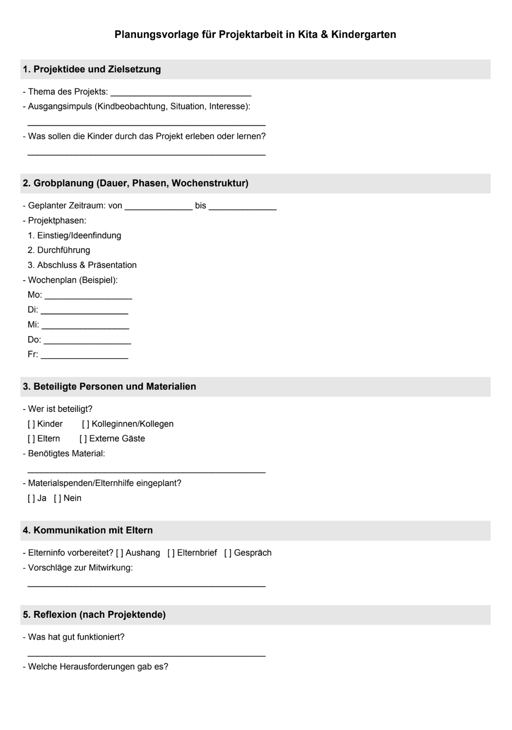 Eine gute Projektplanung beinhaltet klare Ziele, eine grobe Zeiteinteilung (z. B. Wochenplan) und vielfältige Aktivitäten wie Basteln, Singen oder kleine Ausflüge. Wichtig: Plane mit Herz, aber bleib flexibel! Beziehe das Team und die Eltern mit ein – gemeinsam wird das Projekt lebendiger.