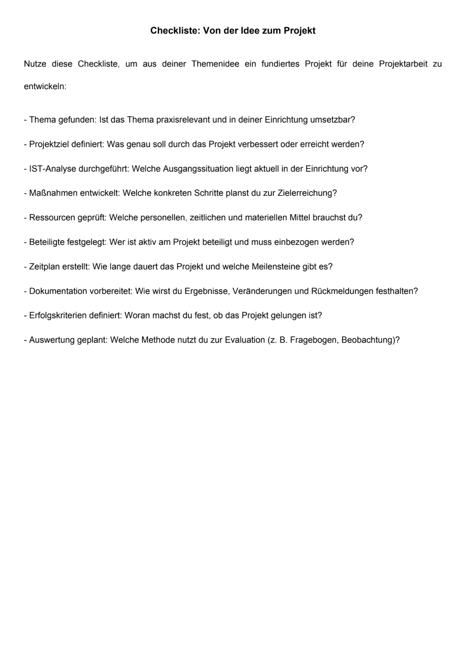 In der pdf findest du eine Checkliste für deine Projektentwicklung: