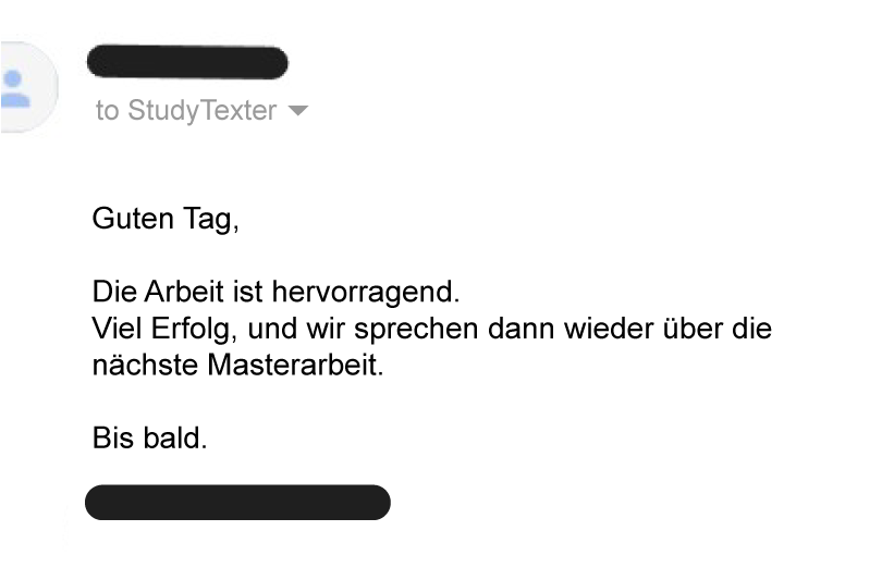 **Die Kundenmeinungen stammen von echten Studenten, die in ihrem Studium mit der Hilfe von Studytexter gearbeitet haben. Wir erheben keinerlei Anspruch auf garantierte Noten und ermutigen nicht zur Abgabe der unbearbeiteten Arbeit an deiner Universität. Dennoch halten wir fest, dass Untersuchungen gezeigt haben: Der durchschnittliche Student spart über 80 % seiner Arbeitszeit mit einer vorerstellten Arbeit von Studytexter.de.**