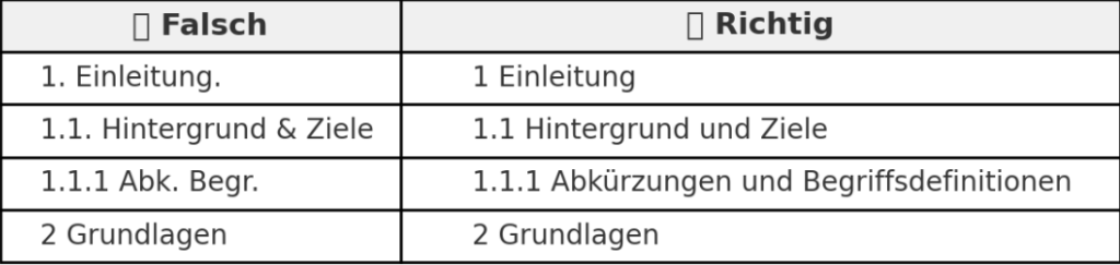 - Nummerierung: Verwende konsequent das dezimale System (1, 1.1, 1.2 …).