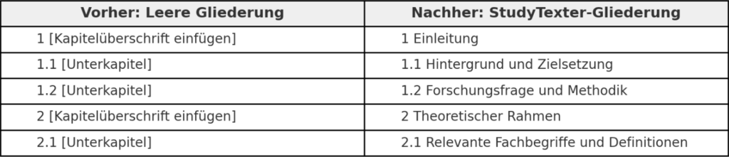 💡 Wie StudyTexter dir hilft: Hier können wir aufzeigen, wie StudyTexter nicht nur ein Inhaltsverzeichnis erstellt, sondern direkt eine vollständige Gliederung nach wissenschaftlichen Standards generiert – inklusive passender Überschriften, automatischer Nummerierung und Zitierweise. Das spart dir nicht nur Minuten, sondern oft Stunden Arbeit.